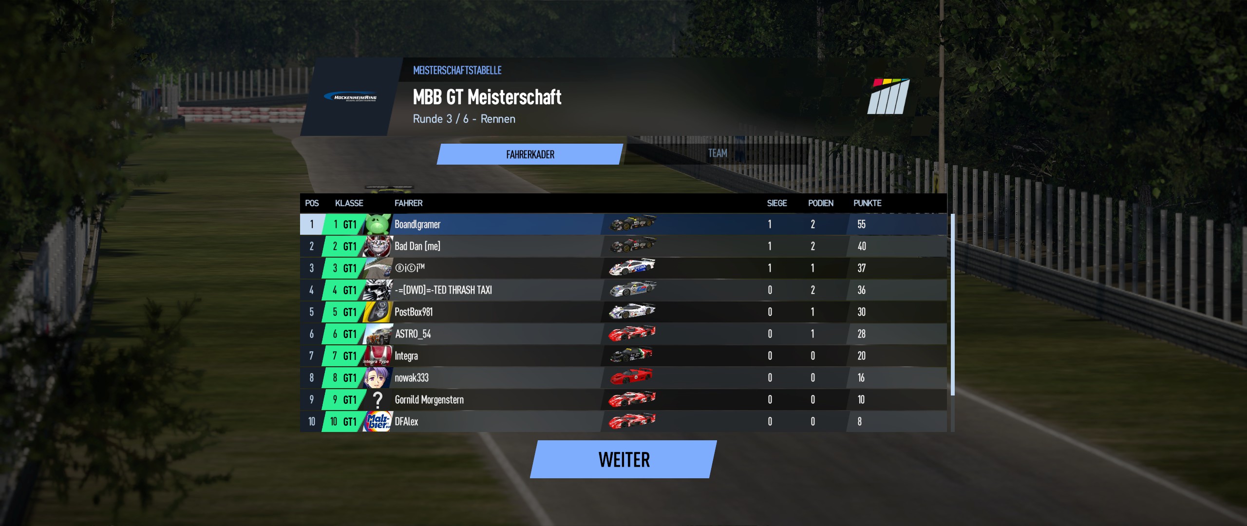 Zu meinem Rennen. Tja, glaube das war meine zweite Pole und zum dritten mal schnellste Rennrunde, das zu meinem persönlichen Potenzial, aber Dan und Boandl zeigen halt in den Rennen immer wieder worauf es am Ende ankommt. Stabile flotte Runden und wenige bis keine Fehler. Von daher ganz verdient da oben. Gratuliere. Ich hatte mal wieder den einen oder anderen Ausritt und habe mal wieder, diese mal hinter Frank, nicht die entsprechende Rennreife einfach mal früher zu bremsen und mir den Gegner richtig zurecht zu legen. Selber Schuld TED Auto war dann hinüber musste Box vorziehen und reparieren und Stand gefühlt ewig. Dann wieder in den Trimm gekommen, Nowak und Integra "geschnupft" und wenigstens auf Kurs Platz4 um dann von Frank noch den dritten geschenkt zu bekommen. Von daher drittes Rennen, zweites Podest, da geht noch was Ich hoffe das sieht nicht nach Selbstlob aus, aber echt tolle Autos und tolle Strecken, ich freu mich riesig aufs nächste Rennen